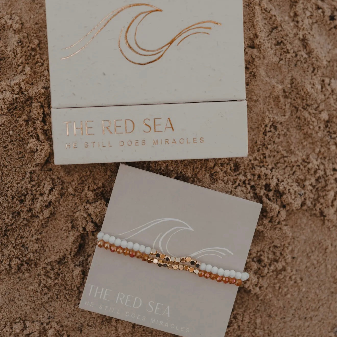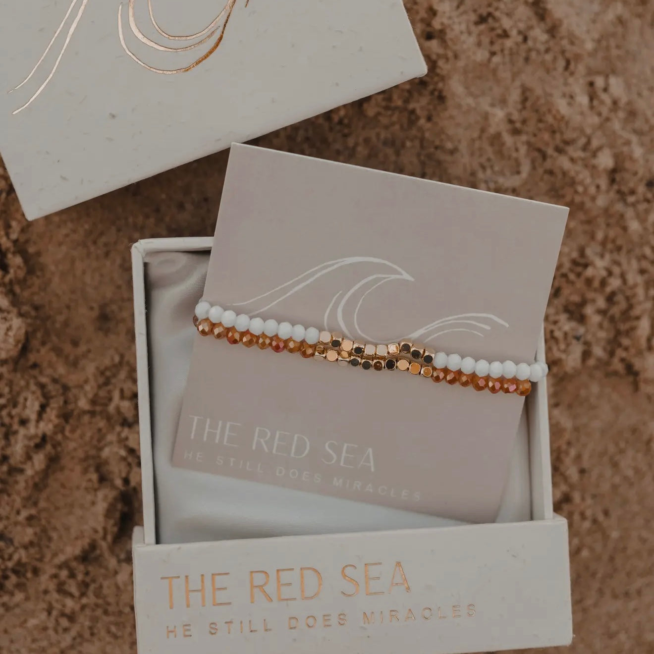 The clay bracelet represents the moment in the Bible when Moses parted the Red Sea, and the white bracelet represents the Lord who was with him every step of the way.